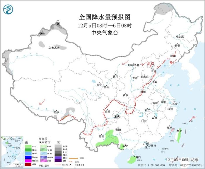 12月5日08时至6日08时,内蒙古东北部、黑龙江西北部、新疆北疆北部和南疆西部山区、西藏东南部等地部分地区有小到中雪或雨夹雪,其中,新疆北疆北部局地有大雪或暴雪(10~13毫米);贵州西南部、云南东部、广西西部、海南岛大部、台湾岛东部等地部分地区有小雨。内蒙古中部、河北北部、辽宁中东部、西藏北部等地部分地区有5~6级风,阵风7级;台湾海峡、巴士海峡、南海东部和中西部以及西南部海域将有5~7级风、阵风8级。